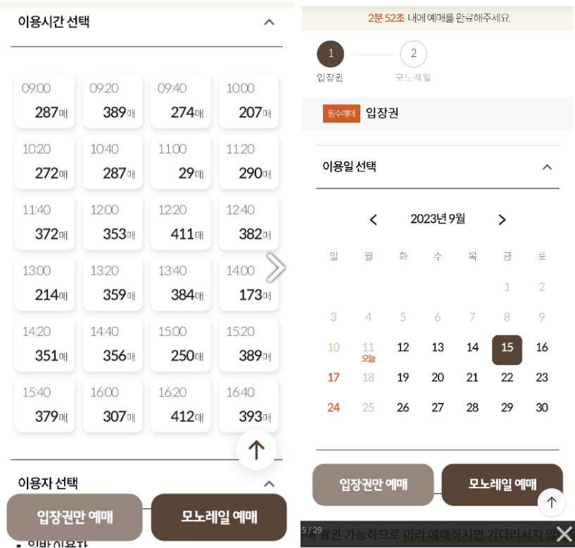 남아있는 시간과 날짜를 확인 후 원하시는 옵션으로 예매 진행해 주시면 됩니다. 3분 안에 모든 예약을 마쳐야 하므로 미리 이용날짜랑 시간을 생각하시고 예약하시길 바랍니다. 참고로 2023년 예상 단풍 절정의 시기는 10월 30일로 10월 말에서 11월 초 가 가장 치열할 것으로 예상됩니다.